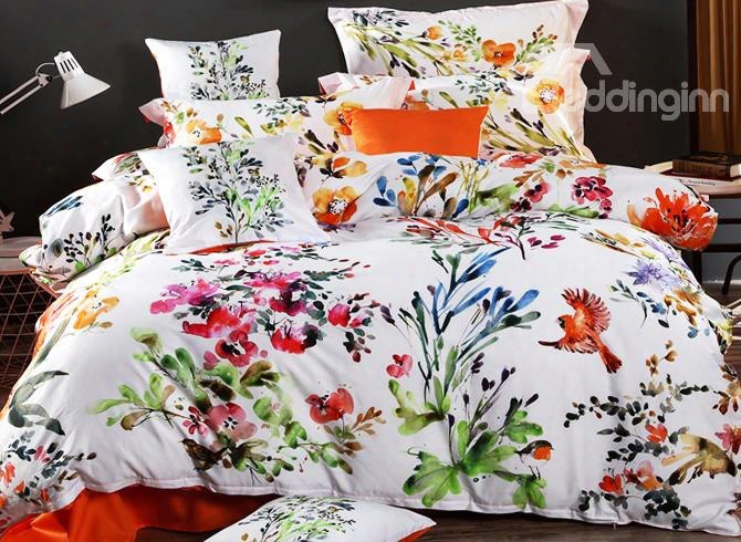 Designer 60s Brocade Birds Flowers Watercolor Painting Pastoral Style 4-piece Cotton Bedding Sets