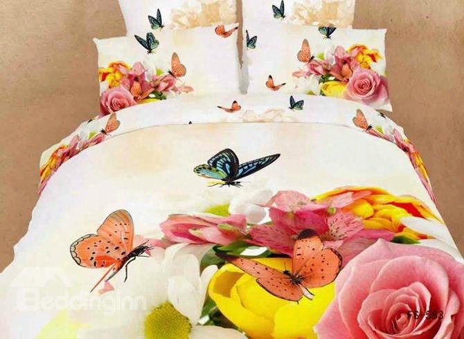 3d Colorful Rose And Butterfly Printed Cotton 4-piece White Bedding Sets/duvet Covers